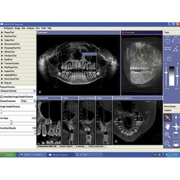 Sirona 3D imaging with new Cone Beam Computer Tomography technology goes beyond traditional diagnostics and treatment capabilities by calculating a large volume 3D image set - more than 200 exposures - in a single low-dose 3D scan of 15 seconds or less. This 3D image set is processed and presented in the new Galaxis software, an advanced extension of Sirona's renowned Sidexis XG imaging software. The imaging unit and its software work in complete harmony to provide new options for preoperative planning.
