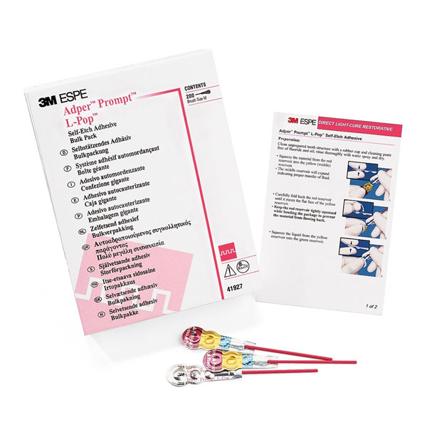 This one-step, unit-dose, self-etch adhesive is now improved to better meet your bonding needs. 3M ESPE Adper Prompt L-Pop Self-Etch Adhesive offers easier activation for a more consistent, reliable mix and improved chemistry for better dentin bond strength. It also provides an aggressive enamel etch, and a higher viscosity that allows for a more uniform, consistent layer. Plus, it's self-etching to reduce post-operative sensitivity.