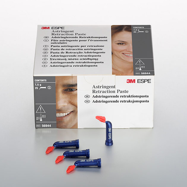 New 3M ESPE Astringent retraction paste provides effective gingival retraction fast. Compared to retraction cords, the innovative system can cut up to half the time from the gingival retraction procedure and is up to 30% faster than the leading retraction paste while effectively deflecting the marginal gingiva and providing long-lasting haemostasis. Astringent retraction paste is dispensed using a common composite dispenser and the capsule's patented extra-fine tip is designed to actively open the sulcus and easily deliver the high-viscous astringent paste into the sulcus. The capsule also has a flexible, soft-edge tip and an orientation ring, like a perio probe. Both of these features allow dentists more precise control and easy intra-oral handling. Each single use unit-dose retraction capsule contains 15 percent aluminum chloride, recently recognized by researchers as being as effective as epinephrine soaked cord in reducing the flow of sulcular fluid.