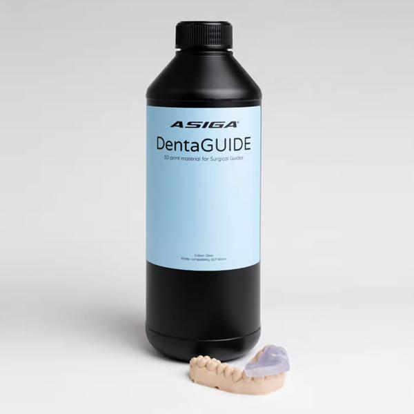 Asiga DentaGUIDE is a rigid, clear, autoclavable, biocompatible material engineered for the fabrication of surgical guides. Optimised for UV (385nm) printers, Asiga DentaGUIDE accurately realises glue channels, positioning windows, and drill holes allowing clinicians to effectively place implants accurately and with ease.