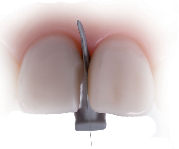 FenderWedge Prep from Directa Dental Sweden is a combined wedge and steel plate that protects the adjacent tooth and surrounding gingiva. FenderWedge Prep has a thin and "boat-shaped" tip which allows it to be inserted into tight proximal spaces at the same time as it condenses the gingiva without damage. FenderWedge Prep can be inserted buccaly or lingually. The steel plate is perforated thus allowing it to be bent before insertion so that it will lean against the adjacent tooth to be protected, providing better space and vision, saving time and increasing safety. The wedge with its conical profile is pushed so it sits tightly.