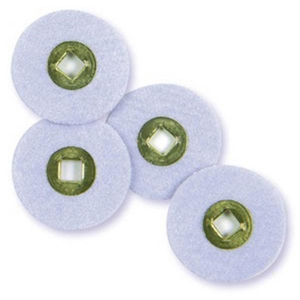 Use these highly flexible felt and mylar dental polishing discs with Enamelize, or polishing paste of choice, to put the final luster on dental resin, porcelain, metal and natural tooth structure. These unique felt coated, highly flexible mylar discs will help make the application and use of your polishing paste easier and more effective. The extreme flex of the buff allows you to closely hug the contour of any tooth, leaving no area unpolished. Regular FlexiBuffs will fit any standard moore mandrel.