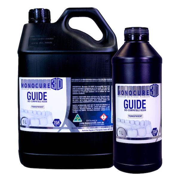 Monocure 3D GUIDE™ bio-compatible dental 3D resin has been engineered to fabricate surgical guides. Once post-cured, this material has high tensile strength and is transparent, odourless and tasteless. It has a high heat resistance and is suitable for sterilisation using standard autoclave protocols. It has been certified for intraoral use and is listed on the Australian Register of Therapeutic Goods (ARTG).