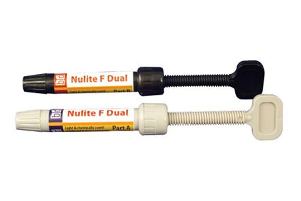 Nulite F Dual Cure offers all the benefits of Nulite F in a composite that can be either light cured or chemically cured. Two component mix of micro-rod reinforced hybrid composite with low shrinkage and high fracture toughness.