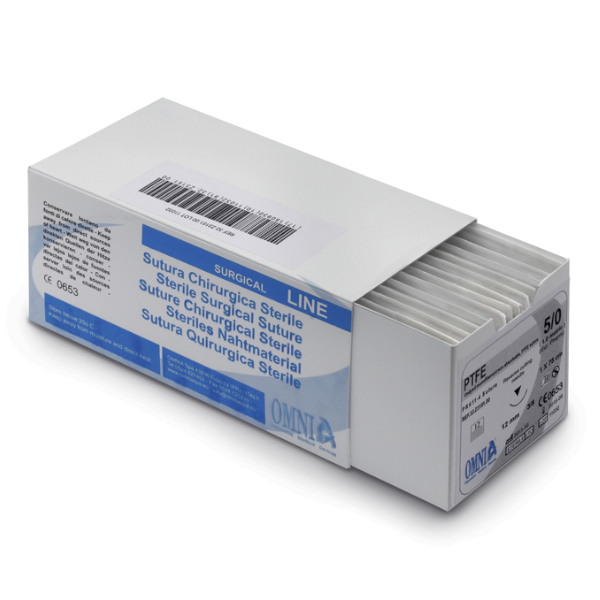 Omnia PTFE sutures are ideal for any implant, periodontal and bone graft surgery where the usage of a monofilament suture with low bacterial adhesion is recommended. Compared to other monofilament synthetic sutures, this material is highly tolerated in the oral cavity. Further, PTFE sutures are ideal to limit inflammation, bleeding and other collateral effects which may occur during the soft tissue approximation.