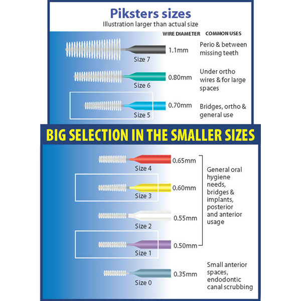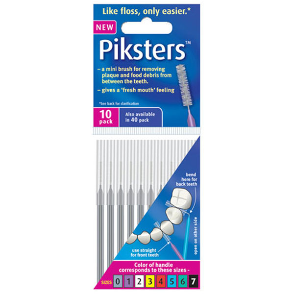 Piksters are an Interdental Brush that very effectively cleans the gaps between teeth and removes decaying food particles which may cause bad breath, plaque formation and gum disease. Piksters are like a toothpick with bristles and these bristles have the capacity to expand into the indents on the teeth surfaces, particularly at the gum line of molars and premolars. Most people find Piksters easier to use than floss a they can be used one handed and they really give you a “just cleaned” feeling. People that have implants, crown and bridgework, braces or periodontal disease need to pay special attention to these areas and Piksters makes this job a lot easier. Toothbrushes and floss are often not as suitable in these situations as they have difficulty gaining access.