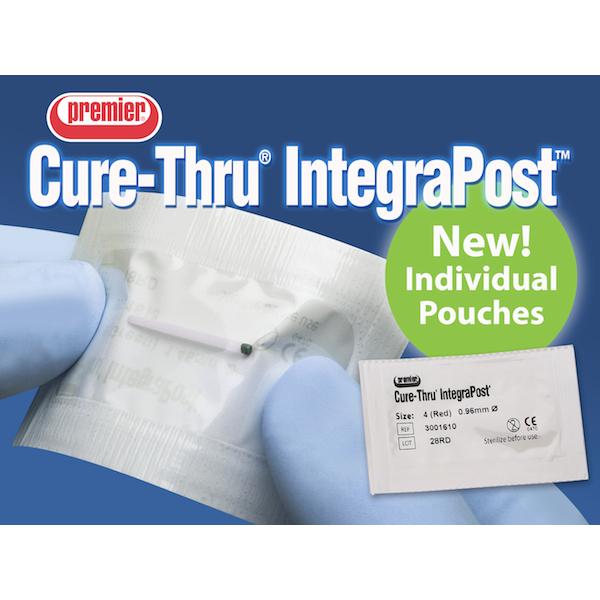 Premier Dental Products Company is pleased to announce Cure-Thru IntegraPost are now available in individual pouches that provide easy identification with written details of the post on one side and a see through panel on the opposing side for visual inspection. The discrete unit packaging keeps the post clean and protected and easy to distribute to multiple operatories. The posts are easily removed from the pouch which protects them against contamination. Cure-Thru posts are pre-silanated so they are easy to use and chemically adhere to resin cements and composite core build-up materials, resulting in a homogeneous all-composite restoration. Cure-Thru IntegraPosts are available in four diameter sizes, in refill packages containing 10 individual pouches of each size. Also available in kit packaging configurations - through your authorized dealers.