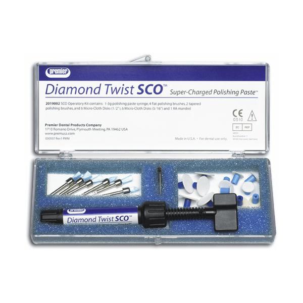 After permanent seating and adjustment, polish crowns, inlays, onlays and nano-hybird composites intraorally in one easy step using Diamond Twist Super-Charged Polishing Paste. Use the flat or taper polishing brushes (autoclavable) for posterior occlusal surfaces. Use the Micro-Cloth disks for polishing and final high-gloss buffing. Twist syringe avoids cross-contamination and dispenses just the right amount. The Diamond Twist SCO Kit contains: (1) 3g Diamond Twist Polishing Paste Syringe, (6) 1⁄2” Micro-Cloth Disks Dark Blue, (6) 5⁄16” Micro-Cloth Disks Light Blue, (1) RA Mandrel, (4) Flat Polishing Brushes and (2) Tapered Polishing Brushes.