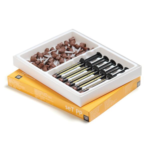 seT PP is the syringe version of seT, SDI's all-in-one, radiopaque encapsulated luting cement. It etches, bonds and fills with just one component. Simply apply seT PP and seat your prosthesis. Containing ionglass, seT PP has been specifically designed to release a consistently high dose of fluoride over a prolonged period of time. The proprietary glass formulation serves as a caries preventative system by providing replenishment of fluoride to the oral environment. seT PP minimizes post operative sensitivity as it does not require separate etching and washing. The smear layer remains intact to protect the tooth which reduces post-operative sensitivity. seT PP is a dual cure system. The material hardens in 5 minutes by itself or just 20 seconds with the aid of a curing light. seT PP is available in 5 shades (Translucent, A1, A2, OA3, and Opaque White) and packaged in an introductory kit of 5 syringes, or refills containing 2 syringes.