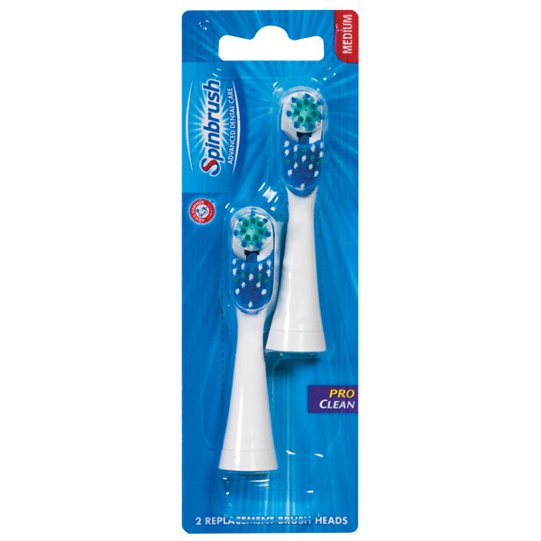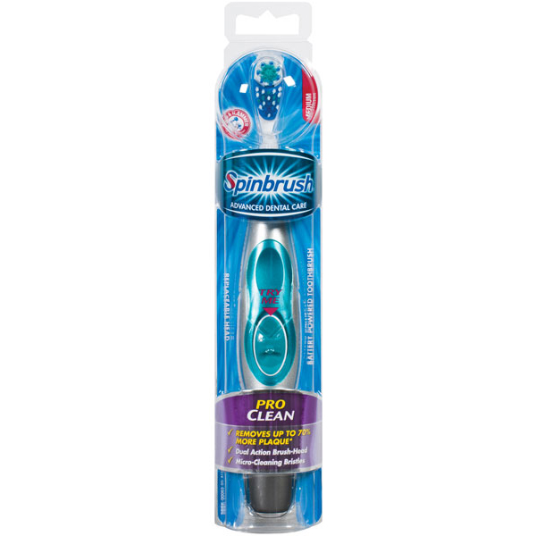 Spinbrush ProClean is a new battery operated toothbrush by Arm & Hammer. Spinbrush ProClean features dual-action technology, a combination of spinning and back and forth brushing heads for ultimate cleaning. Removes up to 70% more plaque in hard to reach places than a normal toothbrush. Spinbrush ProClean comes with replacement heads.
