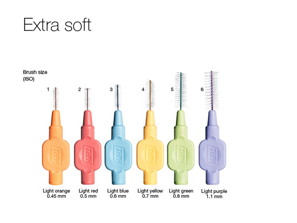 TePe Interdental Brushes are available with specially selected, extra soft filaments for gentle cleaning. TePe Interdental Brush extra soft is recommended for delicate oral tissue or inflammation and for patients with mucosal sensitivity. It also suits everyone who prefers a softer interdental brush. The extra soft range comprises six sizes (click to see all sizes).