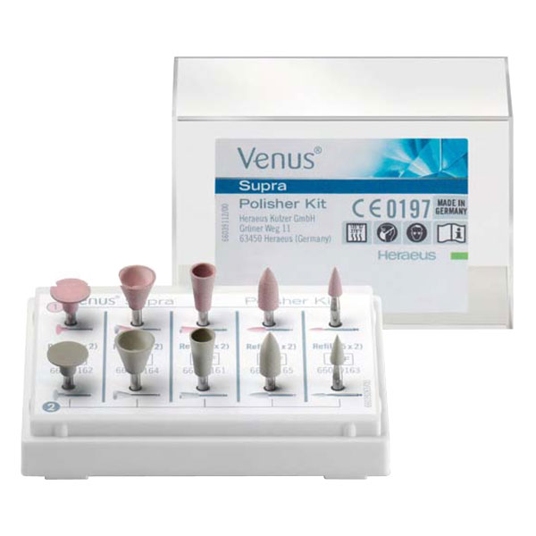 Venus Supra are rubberized polishers made of silicon highly filled with microfine diamond powder for polishing all types of composites to high gloss. Pre- and high gloss polishers in 5 different shapes provide a universal solution for all anterior and posterior restorations. Venus Supra autoclavable polishers can be re-used several times. Venus Supra allows the creation of invisible, naturally glossy restorations in only two steps.