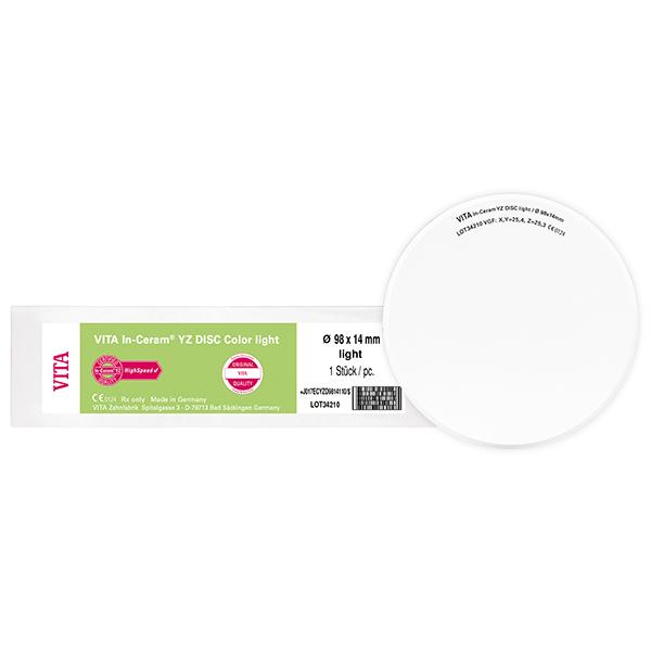 The VITA In-Ceram YZ DISC Color is available precolored in monochromatic shades. The controlled coloring process based on industrial standards provides results in uniform quality of shades so that time-consuming and error-prone manual coloring is no longer required. A total of three shade variations is available - VITA In-Ceram YZ DISC Color light, medium and intense. If required, additional coloring with VITA In-Ceram COLORING LIQUID can be carried out to achieve even subtler shade variations. VITA In-Ceram YZ DISC Color is available in the usual sizes with a diameter of 98 mm and in heights of 14 mm and 18 mm.