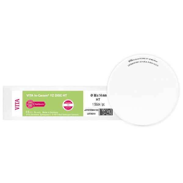 The VITA In-Ceram YZ DISC HT is a highly translucent material ideal for the efficient fabrication of monolithic, fully anatomical zirconia restorations since veneering is not required thanks to the high translucency. This provides for a relatively inexpensive yet attractive alternative to non-veneered or partially-veneered metal restorations. The HT-DISC is also a suitable substructure material for restorations intended to exhibit natural translucency. VITA In-Ceram YZ DISC HT is available in the usual sizes with a diameter of 98 mm and in heights of 14 mm and 18 mm.