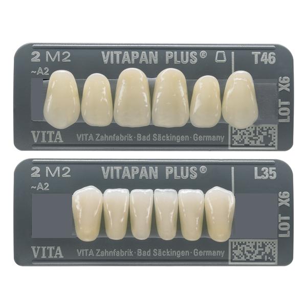 The development of VITAPAN PLUS is based on the VITAPAN classic and requests, suggestions and requirements of users from all over the world. Theproven VITA MRP material was used to create an innovative anterior tooth which guarantees simple and reliable use and impresses with its lifelike aesthetic appearance. As far as scaling of VITAPAN PLUS is concerned, it was ensured that the width of a set of upper teeth is always within a range of + 40 to + 50 mm in accordance with the results of empirical studies and that the entire range of sizes required can be covered with a minimum number of moulds. Now the product line for the upper jaw includes a total of seven ovoid moulds (including the new moulds O43 and O47L with extended neck), seven triangular moulds (including the new moulds T42, T48, T 50 and T54), three rectangular moulds (including the new mould R45) and the new square mould S46. Six sets are available for the lower jaw (including the new L37L mould with an extended neck). The range of shades comprises all VITA classical A1 - D4 shades (with the exception of B1), as well as the VITA SYSTEM 3D-MASTER shades 1M1 - 5M3, including 0M1 and 0M3.