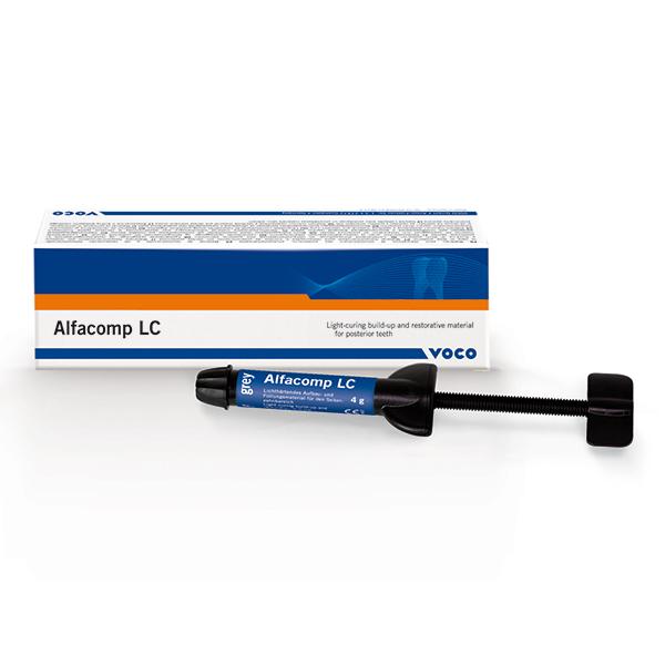 VOCO Alfacomp LC is a light-curing build-up and restorative material for the posterior tooth area. The grey-coloured composite is ideal for core build-ups and class I and II restorations. VOCO Alfacomp LC offers visible differentiation between restorations and tooth hard substance through its grey colouring and despite its simple application, it has excellent physical properties. VOCO Alfacomp LC has high radiopacity and can be used with any light-curing dentine/enamel bonding agent.
