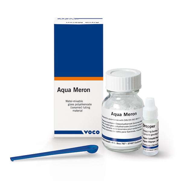 The water-mixable luting cement Aqua Meron, is ideally suited for luting crowns, bridges, inlays, onlays and orthodontic bands. The main advantage of this material is its low acidity, a property which is often of crucial importance when carrying out treatment on teeth that have undergone extensive grinding and on cavities in the vicinity of the pulp. The microfine consistency of Aqua Meron ensures optimum wetting properties, resulting in thin and even layers. There is no risk of an increase in bite elevation caused by excessive film thickness. As with other VOCO "Aqua cements", Aqua Meron simplifies the storage of materials because it is mixed with water.