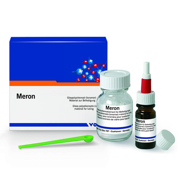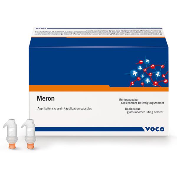 Meron is designed for luting indirect restorations of different types: metal-based crowns, bridges, inlays and onlays, high-strength all-ceramic crowns and bridges as well as metal-based and high-strength all-ceramic crowns and bridges on implant abutments. Meron is additionally suitable for luting metal root posts and indirect metal post core build-ups, prefabricated steel crowns and orthodontic bands. The capacity of the application capsule allows even large-scale restorations to be luted in place easily and with excess material.